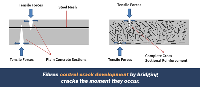 - Mejor control de grietas: Las fibras actúan desde el momento en que aparece la microgrieta.